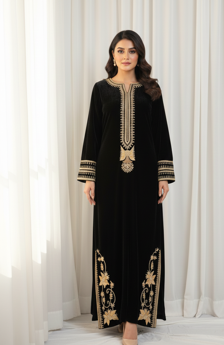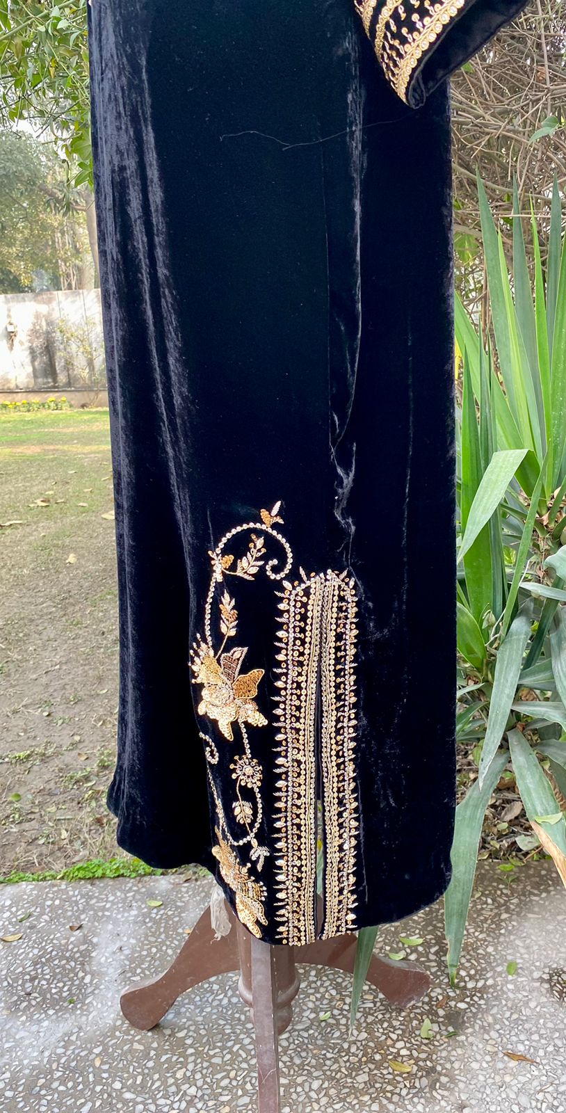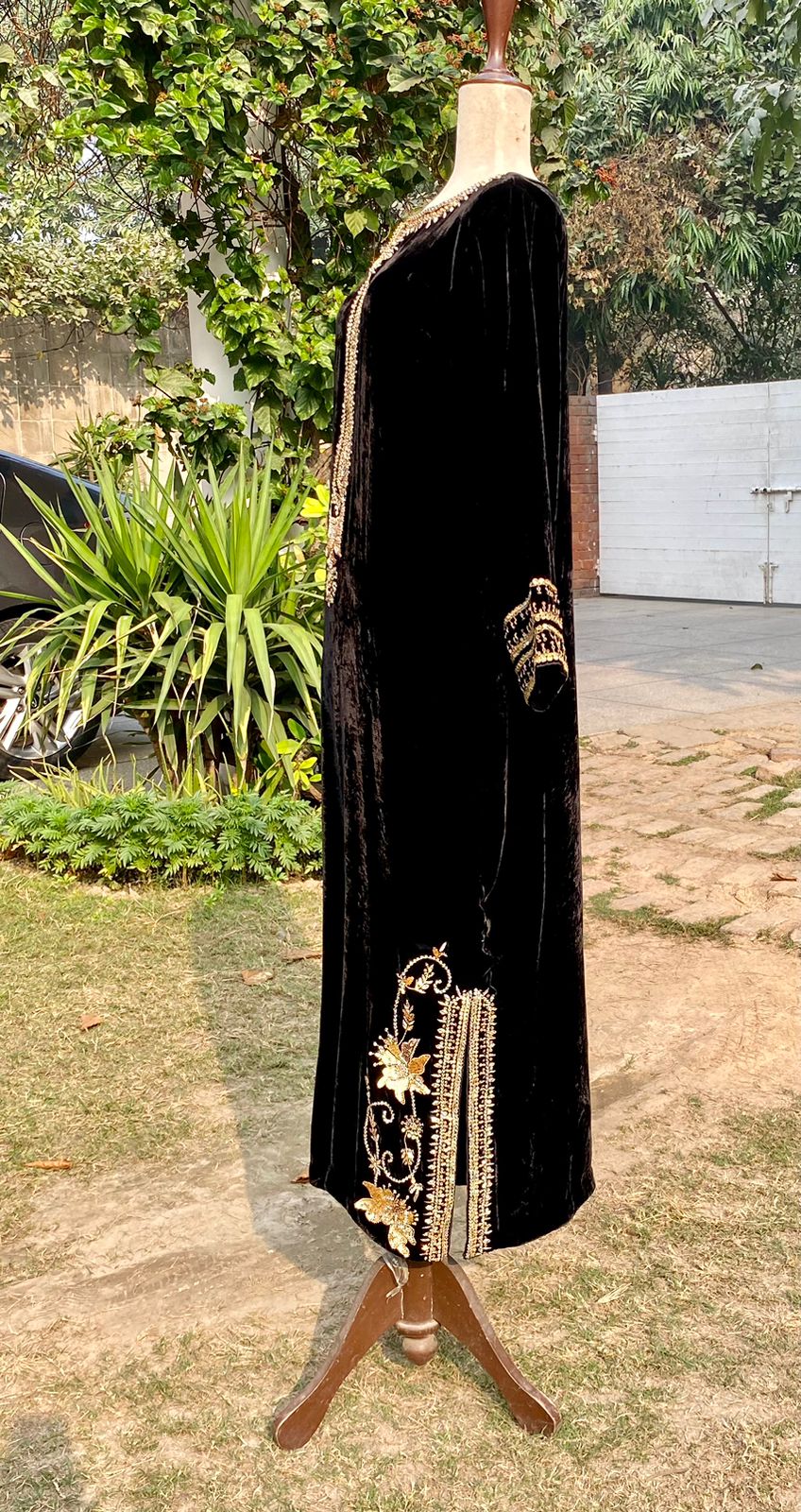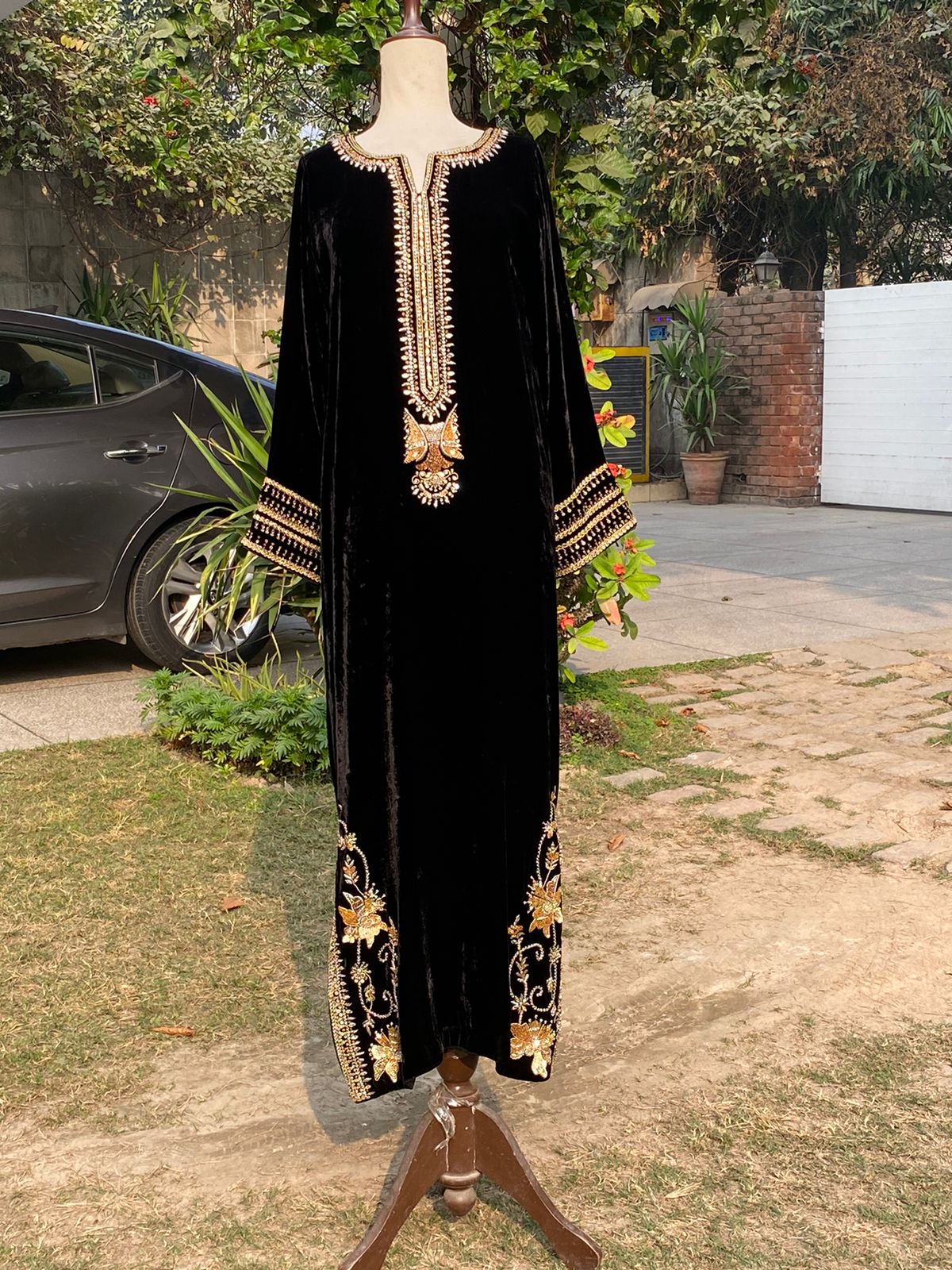 Elevate your wardrobe with this stunning black phoenix velvet kaftan, a masterpiece of traditional craftsmanship and contemporary elegance. Adorned with intricate zardozi embroidery and shimmering sequins, each piece features delicate pearl work that catches the light beautifully. The luxurious velvet fabric drapes gracefully, creating a silhouette that's both comfortable and sophisticated.