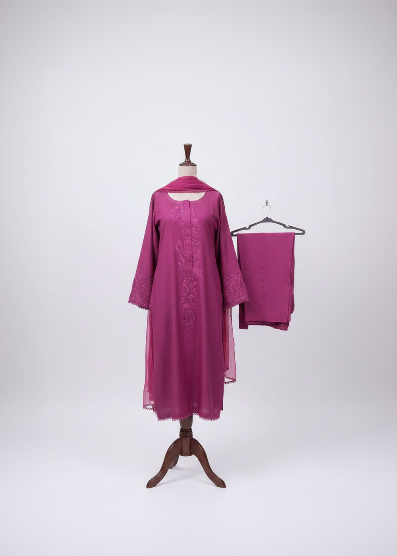 A refined expression of traditional craftsmanship, this ensemble features a karandi shirt and trouser adorned with intricate aari embroidery. The rich texture of karandi fabric is complemented by a softly finished chiffon dupatta detailed with elegant lace, adding lightness and movement to the look. Thoughtfully stitched for a polished silhouette, this outfit is ideal for festive gatherings, formal occasions, and elegant daytime events.