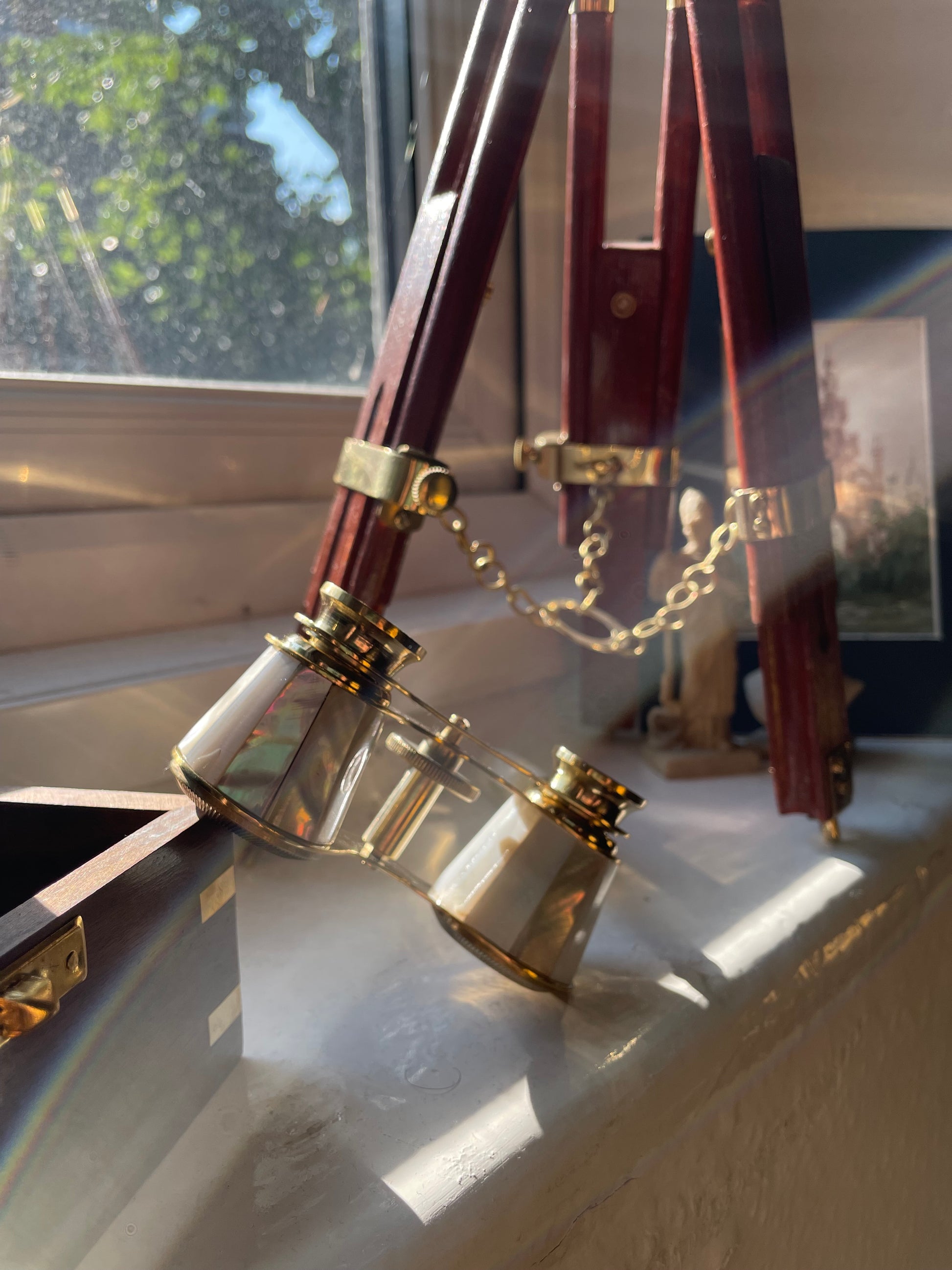 These handcrafted brass opera glasses feature stunning mother of pearl accents, an adjustable focus dial, and an extendable handle for a comfortable grip. Perfect for theater lovers, concertgoers, and vintage collectors, they blend beauty with function.