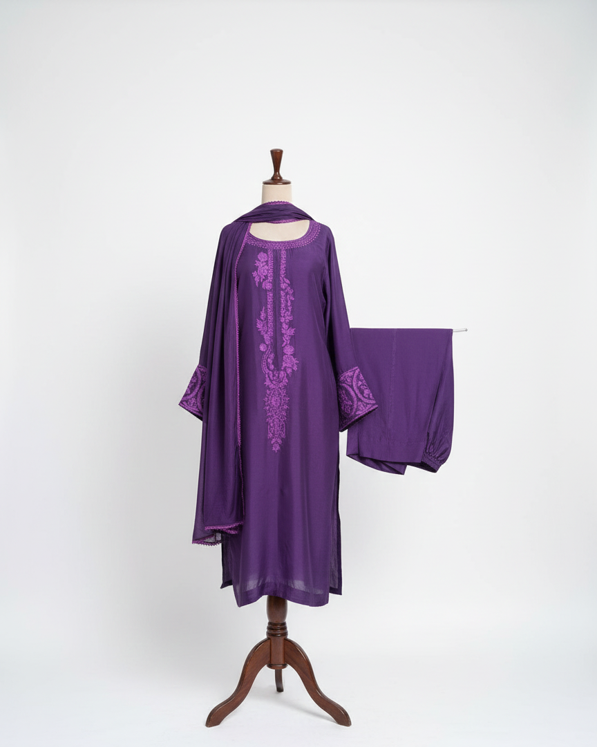 A refined expression of traditional craftsmanship, this red ensemble features a karandi shirt and trouser adorned with intricate aari embroidery. The rich texture of karandi fabric is complemented by a softly finished chiffon dupatta detailed with elegant lace, adding lightness and movement to the look. Thoughtfully stitched for a polished silhouette, this outfit is ideal for festive gatherings, formal occasions, and elegant daytime events.