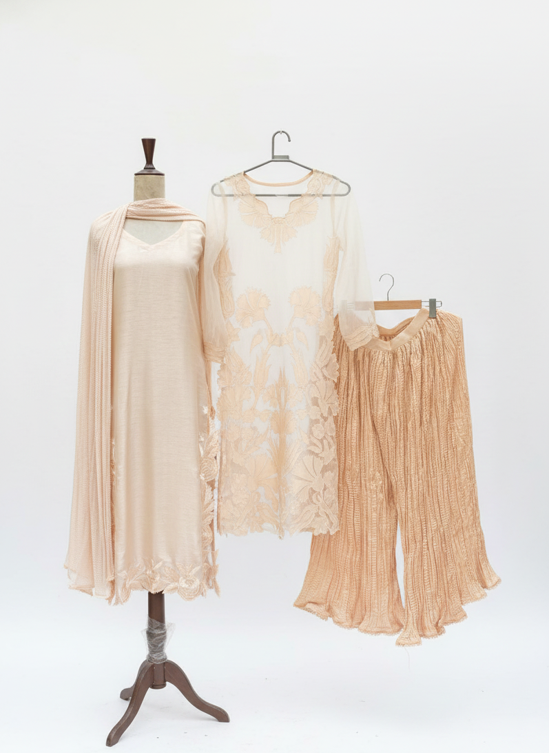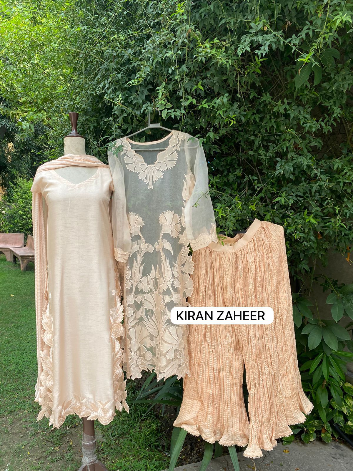 A striking balance of texture and craftsmanship, this statement ensemble features a pure organza shirt adorned with intricate appliqué work, layered over a finely embroidered Korean raw silk inner. The look is paired with medium silk crushed pants that add depth and movement, while a matching crushed dupatta completes the ensemble with fluid elegance. Designed for contemporary festive wear and refined celebrations, this outfit exudes modern luxury with artisanal detail.